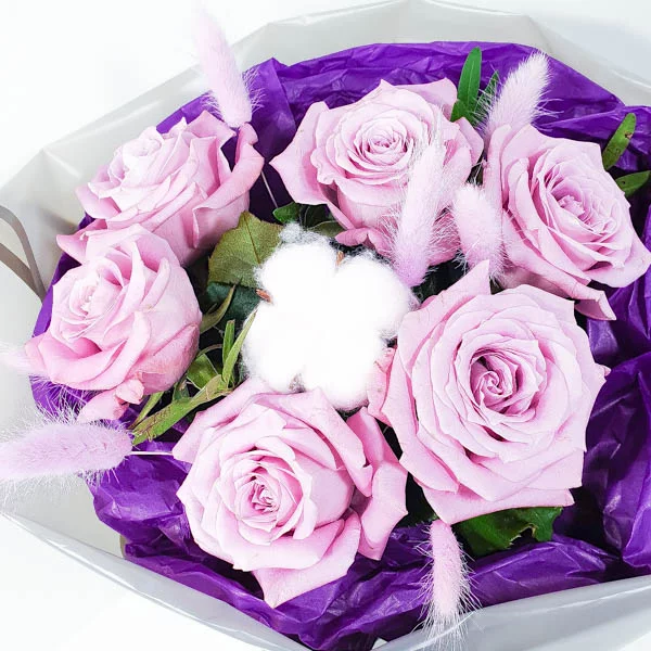 "Лиловое настроение" - это букет, который прекрасно подходит для подарка любимому человеку или для декора интерьера. Цветочная композиция состоит из роскошных сиреневых роз, которые прекрасно сочетаются с мягким и абсолютно нежным хлопком. Букет оформлен в яркой фиолетово-серой упаковке, которая добавляет ему дополнительную изюминку и стиль. Этот букет идеально подходит для любого праздника или специа